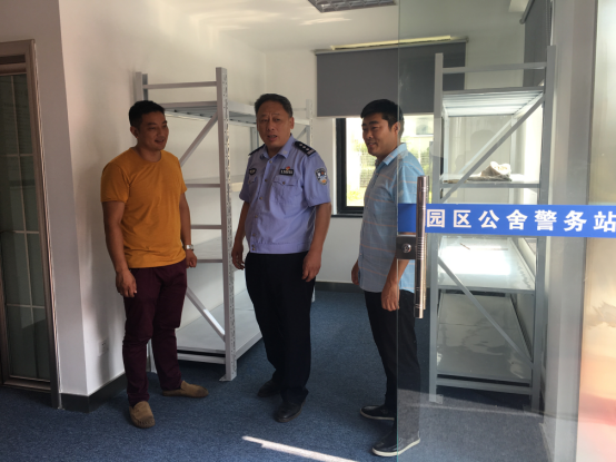7月28日下午,園區(qū)公安分局副局長劉勇一行人來園區(qū)公舍視察公舍警務(wù)室籌建工作進(jìn)展情況,物業(yè)管理部負(fù)責(zé)人范以加陪同視察。