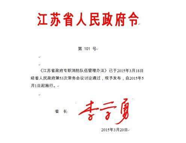 近日,江蘇省省長李學(xué)勇主持召開省政府第53次常務(wù)會議,審議通過了《政府專職消防隊伍管理辦法》(以下簡稱《辦法》)。自2015年5月1日起正式施行。
